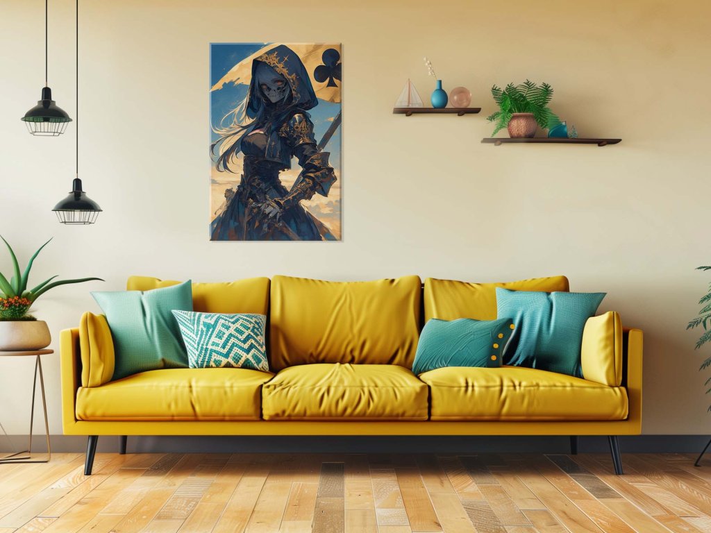 Na obraze je zobrazená temná strážkyňa s lebkou namiesto tváre, jej pohľad je plný odhodlania a jej oči žiaria červeným svetlom. Oblečená je v ozdobenom brnení s motívmi zlatých prasklín, ktoré jej dodávajú majestátny a strašidelný vzhľad. V pozadí sa nachádza vlajka s klubovou kartou, čo symbolizuje jej príslušnosť k neznámemu rádu alebo frakcii.
