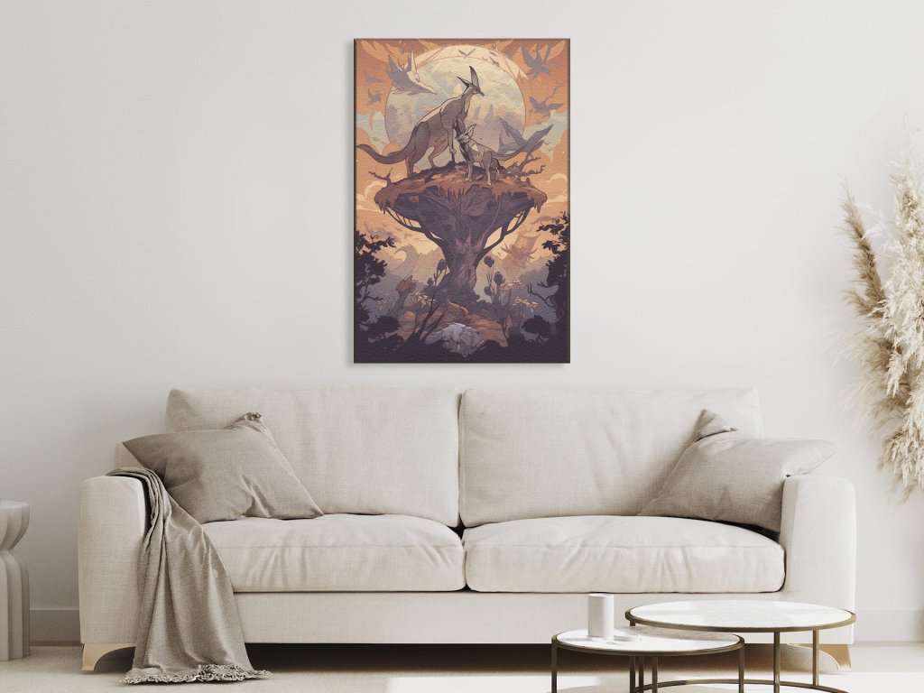Na obrázku sú vidieť mýtické bytosti podobné kengurám, ktoré sa týčia nad krajinou s fantastickým mesiacom na oblohe. Okolo nich krúžia lietajúce stvorenia, zatiaľ čo v dolnej časti scény je zobrazený temnejší a tajomný les. Celá kompozícia je vykreslená v teplých oranžovo-hnedých tónoch, čo vytvára pocit magického zapadania slnka v neznámom svete.