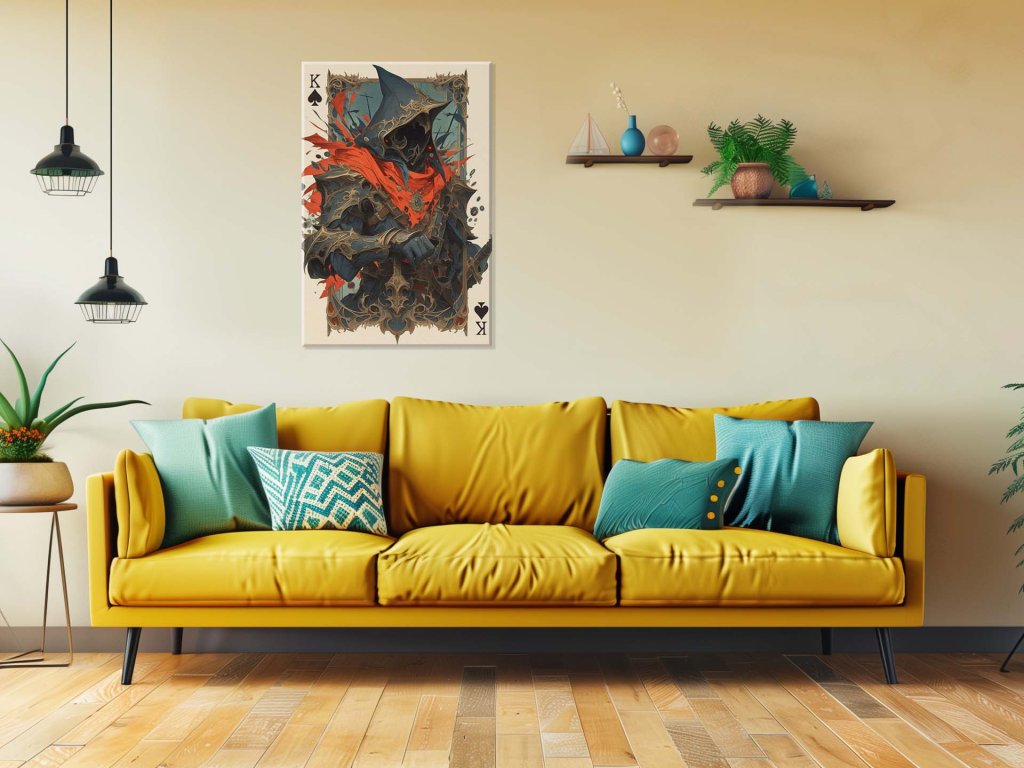 Tento obraz predstavuje Kráľa sŕdc ako postavu z fantasy, obklopenú mystickými a temnými prvkami. Detailné ornamenty a živé červené a modré tóny dodávajú energiu a hĺbku. Vzor na kartách a v pozadí zvyšuje dojem hrozby a moci.