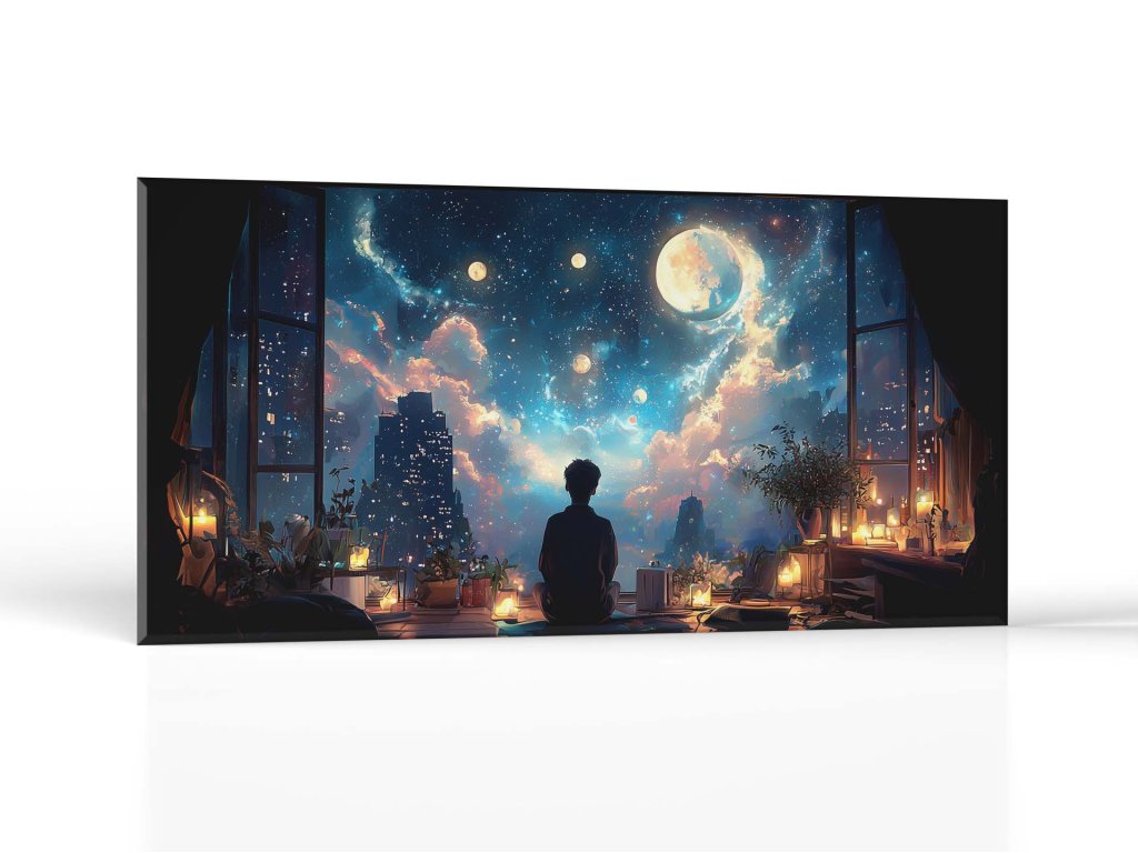 Na obraze je zobrazená postava sediaca pri otvorenom okne, obklopená sviečkami a rastlinami, pričom pozerá na ohromujúcu nočnú oblohu. Hviezdy, mesiace a vzdialené planéty vytvárajú nadpozemskú atmosféru, ktorá človeka pohlcuje. Tento obraz zachytáva moment ticha a premýšľania, kde sa stretáva vnútorný svet človeka s nekonečným vesmírom.