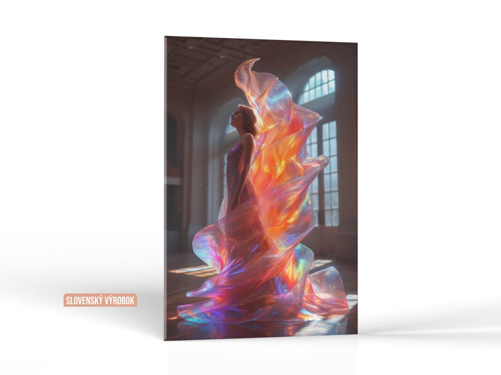Žena stojí v prúde farebného svetla, ktoré prúdi cez okno a odzrkadľuje sa na jej šate.