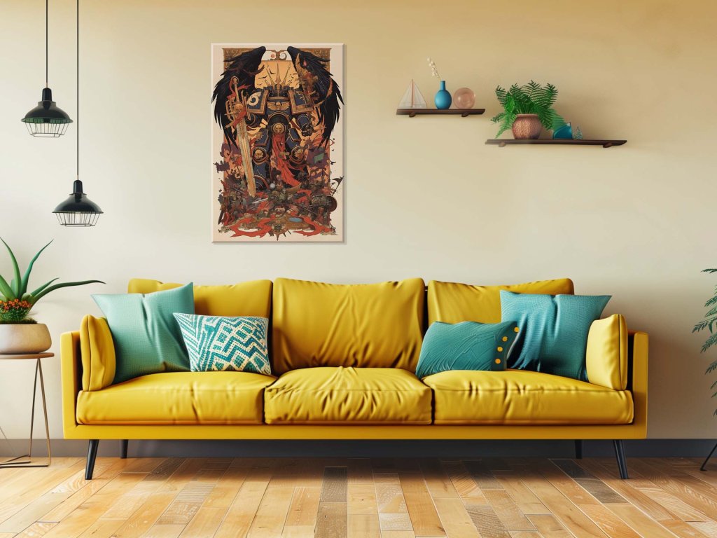 Na obraze je gigantický titan oblečený v zdobenom modrozlatom brnení, so svetelným mečom a krídlami pripomínajúcimi havrany. Okolo neho sa odohráva bitka, kde bojovníci v rôznych brneniach bojujú s veľkou intenzitou. Červené zástavy a zvyšky bitky vytvárajú dramatickú atmosféru plnú napätia a chaosu. Celá scéna vyžaruje epickosť a silu, pričom zdôrazňuje titana ako ústrednú postavu tejto monumentálnej bitky.