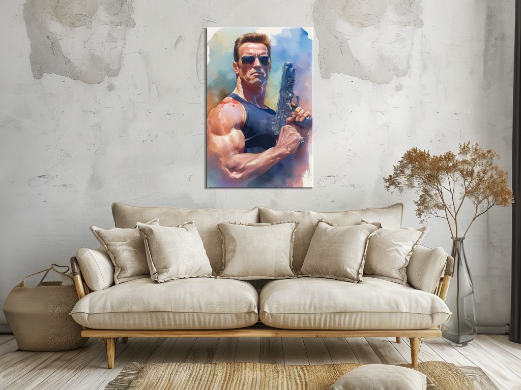 Tento obraz zobrazuje svalnatého muža v čiernom tielku a slnečných okuliaroch, ktorý drží veľkú zbraň. Na jeho ramene je viditeľná krvavá rana, ktorá zdôrazňuje jeho odhodlanie a odolnosť. Pozadie obrazu je farebne rozmazané, čím sa zameriava pozornosť na hlavný subjekt a vytvára dramatický efekt.
