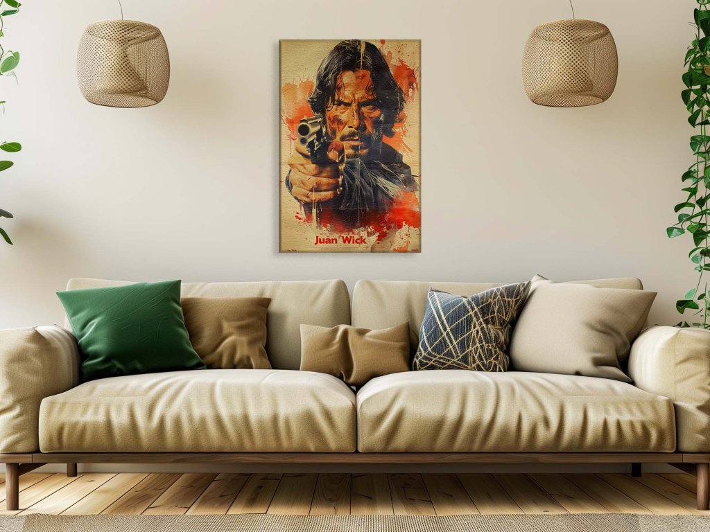 Tento obraz zachytáva temnú a napätú atmosféru s mužom v strede, ktorý cieli pištoľou priamo na pozorovateľa. Jeho tvár je detailne zobrazená s výraznými črtami a hlbokým pohľadom, čo dodáva obrazu silnú emotívnosť. Červená farba akcentujúca obraz pripomína krv a nasvedčuje násilnej téme, zatiaľ čo pozadie a štýl písma naznačujú starý filmový plagát.