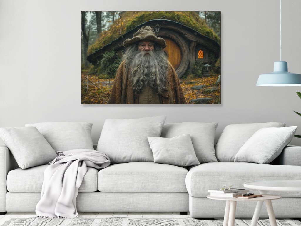 Starý muž s majestátnou sivou bradou a vlasmi, oblečený v hnedom plášti a s klobúkom, pozorne hľadí do diaľky. Stojí na cestičke vedúcej k okrúhlym dverám zahalenej chalúpky, ktorá je súčasťou pokojného, idylického lesného prostredia. Obraz je zachytený v tichom, hmlovom ráne, ktoré zdôrazňuje atmosféru tajomna a pokojnej izolácie.