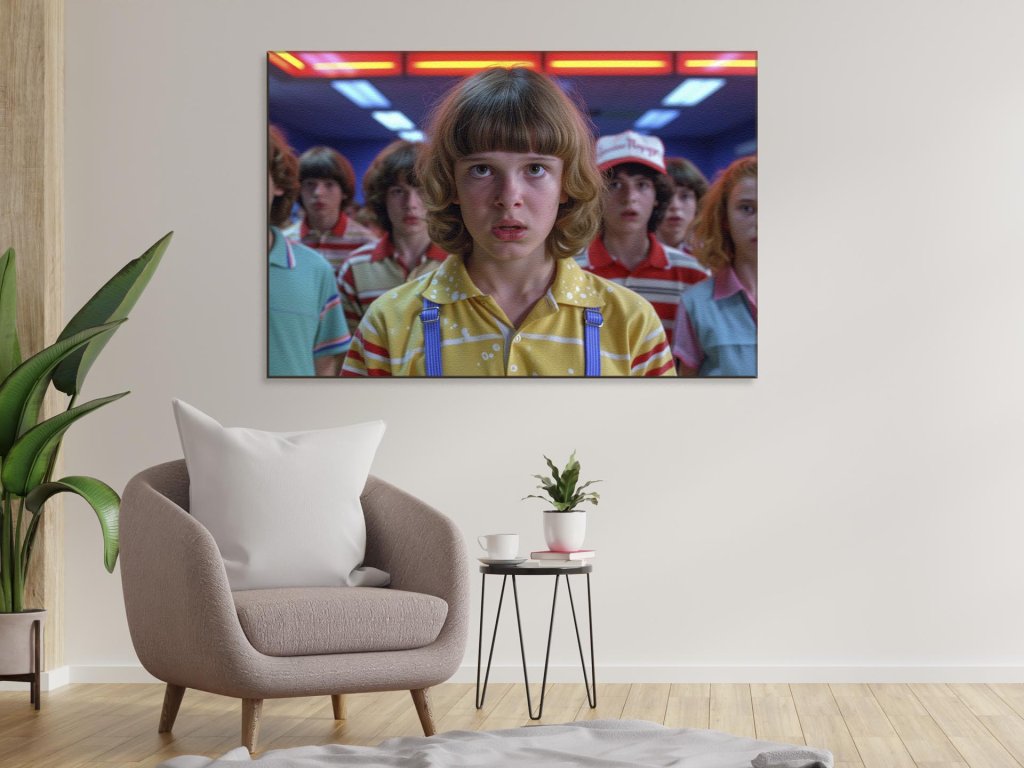 Dievčina zo seriálu Stranger Things s krátkymi hnedými vlasmi a v žltom tričku so štýlovými modrými trakmi pozerá prekvapene priamo pred seba. V pozadí sú ďalšie deti s výrazmi zameranosti a zvedavosti, oblečené v typickom retro štýle. Scéna je zrejme zasadená do interiéru s neónovými svetlami, čo dodáva fotografii dynamickú atmosféru.