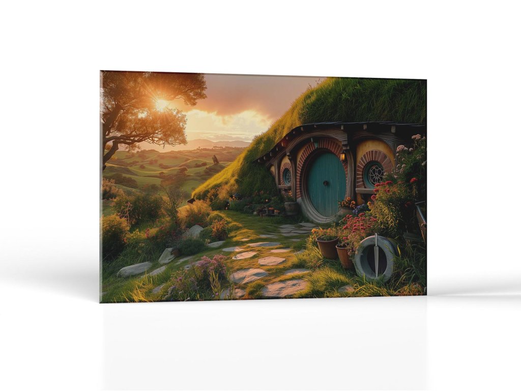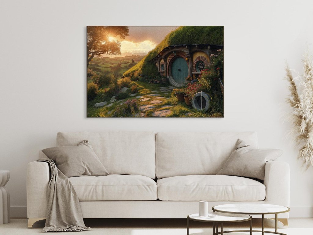 Slnko pomaly zapadá a svojimi lúčmi osvetľuje zelenú krajinku s príbytkami zakrytými trávnatými strechami. Kameňmi dláždená cestička vedie k farebne zdobeným dverám hobitov, zatiaľ čo okolitá záhrada je plná kvetov a rastlín. Atmosféra obrazu vyžaruje teplo domova a pohody v srdci prírody.