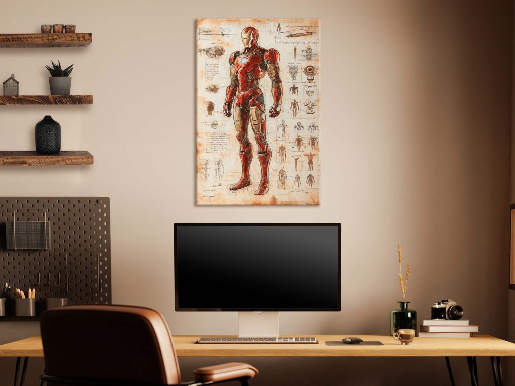 Obraz zachytáva detailný technický nákres moderného bojového obleku Ironmana s futuristickými prvkami a vysokou technológiou. Na nákresoch sú zobrazené rôzne aspekty dizajnu vrátane mechanických komponentov, anatómie a proporcií. Tento návrh evokuje silu, pokrok a kombináciu inžinierstva a hrdinstva v boji.