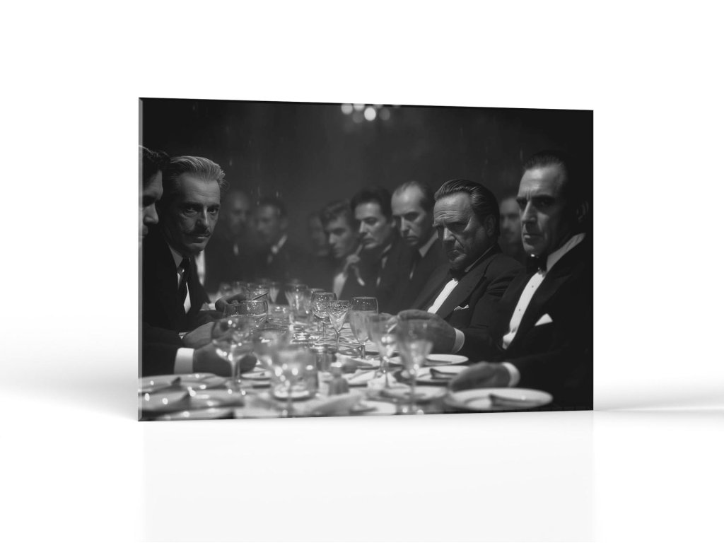 Muži v elegantných tmavých oblekoch a s vážnymi výrazmi sediaci okolo dlhého stola pri slávnostnej večeri alebo stretnutí. Tmavá, rozmazaná atmosféra a svetlá v pozadí naznačujú formálnu alebo možno tajnú udalosť, kde každý detail má svoju váhu. Prítomná tma a sila svetla zvýrazňujú dramatický charakter scény.