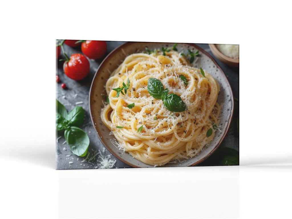 Na obrázku je hlboký tanier s čerstvo uvarenými špagetami, ktoré sú posypané strúhaným parmezánom a čerstvo namletým čiernym korením. Špagety sú ozdobené niekoľkými zelenými listami bazalky, ktoré pridávajú farbu a čerstvosť. V pozadí sú viditeľné čerstvé paradajky a bylinky, čo dotvára atmosféru talianskej kuchyne.