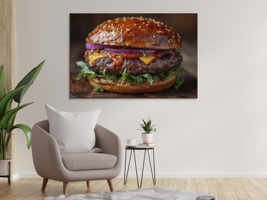 Na obrázku je hamburger s lesklou žemľou, posypanou sezamovými semienkami, ktorá obsahuje šťavnatý hovädzí burger, roztavený syr cheddar, čerstvé rukolové listy, kúsky paradajok a cibule, pokryté korenistou omáčkou. Hamburger je zobrazený na tmavom podklade, ktorý zvýrazňuje jeho farby a textúry.