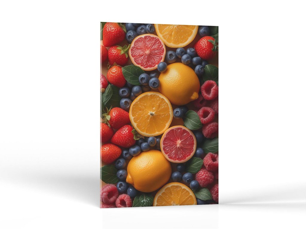 Na tomto obrázku sa pred našimi očami rozprestiera vitamínová hostina z citrusových plodov a lesných bobúľ. Pomaranče a citróny prinášajú sviežu vôňu a sytú farbu, ktorá je ešte umocnená tmavým podtónom sladkých malín a čučoriedok. Červené grapefruity pridávajú do zmesi jemnú horkosť, zatiaľ čo svetlé limetky zas vnášajú do kompozície iskrivú ostrinu. Listy zeleného čaju dotvárajú bohatý vizuálny zážitok, ktorý je nielen pôžitkom pre zmysly, ale aj výzvou k zdravému životnému štýlu. Každý plod je ako malý slnečný lúč, a všetky spolu vytvárajú obraz plný života a energie.