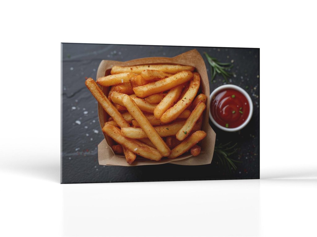 Na obrázku sú zlatisté, opečené hranolky posypané jemnými bylinkami a soľou, podávané v hnedom papierovom obale. V pozadí je malá misa s červenou omáčkou a čerstvé bylinky. Hranolky sú zreteľne krehké a chrumkavé, s lákavým vzhľadom na tmavom podklade.