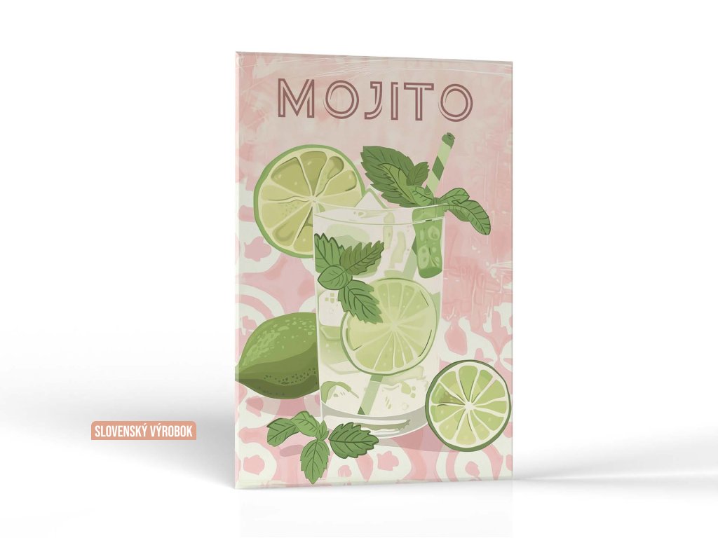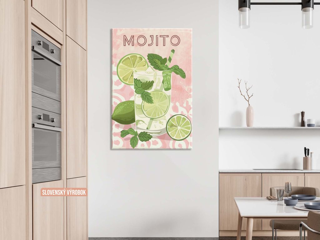 Tento obraz zobrazuje pohár plný osviežujúceho mojita, dekorovaný plátkami limetky a čerstvými lístkami mäty. Ružové pozadie dodáva obrázku hravý a letný vzhľad, ktorý kontrastuje so zelenou farbou ingrediencií. Nápoj je zobrazený v detailoch, čo vyvoláva dojem sviežosti a chutného osvieženia, ideálneho pre horúce letné dni.