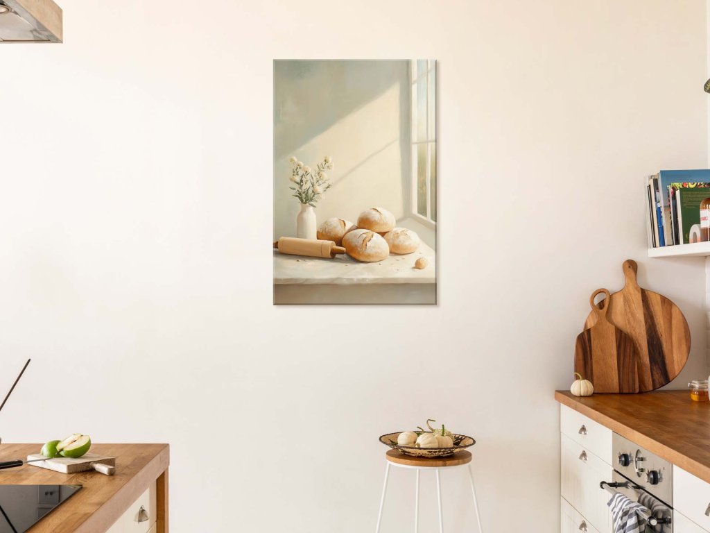 Obraz zachytáva pokojný moment v kuchyni, kde sa ranné slnečné lúče jemne opierajú o múkou posypaný stôl. Na ňom leží päť zlatistých bochníkov domáceho chleba, vedľa ktorých je drevený valček a váza s bielymi kvetmi. Atmosféra vyžaruje jednoduchosť, teplo domova a vôňu čerstvého pečiva.