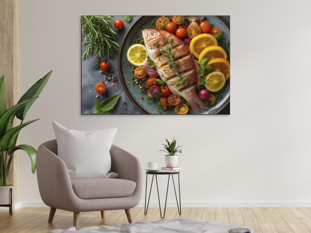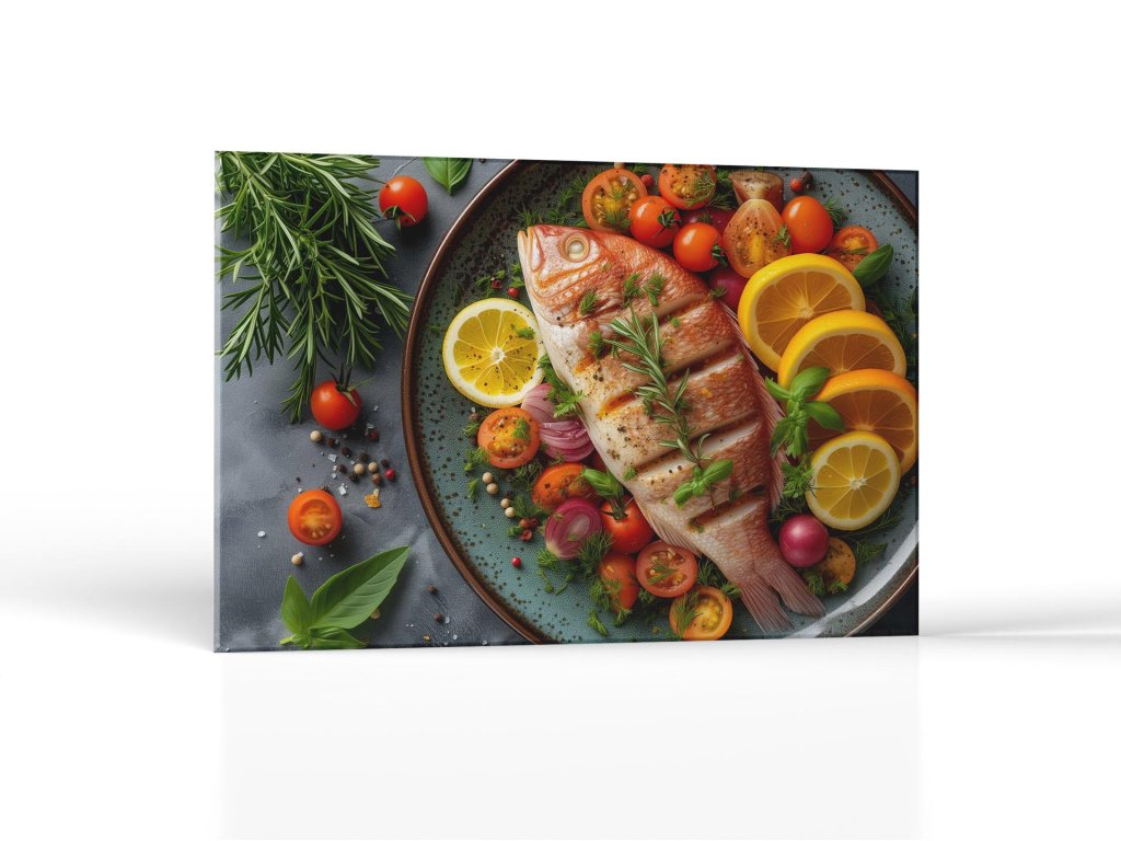 Na obrázku je celá ryba pripravená na pečenie, s plátkami citróna, cherry paradajkami a aromatickými bylinkami. Ryba je bohato posypaná čerstvým korením a pripravená na tmavom keramickom tanieri, čo vytvára rustikálny vzhľad. V okolí taniera sú rozmiestnené suroviny ako bazalka, rozmarín a čerstvé korenie, čo dotvára vizuálnu prezentáciu jedla.