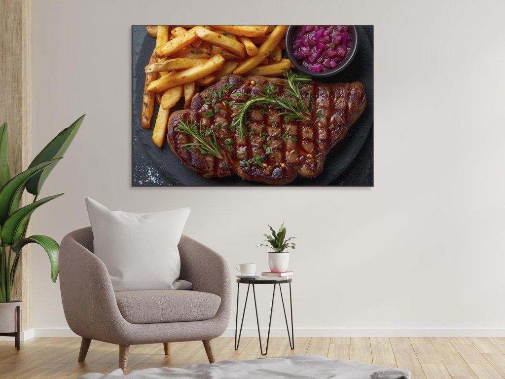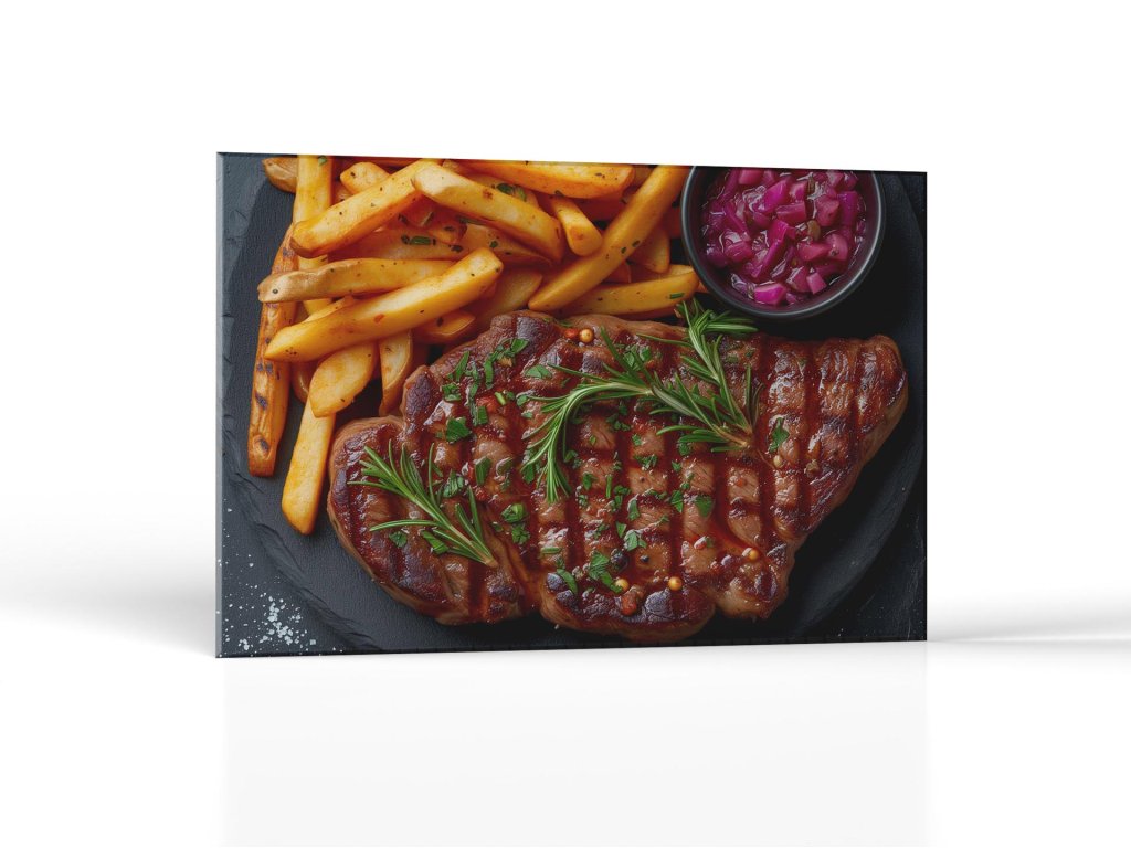 Na obrázku je podávaný grilovaný steak s karamelizovanou povrchovou vrstvou, ozdobený čerstvým rozmarínom a petržlenom. Vedľa mäsa sú zlatisté hranolky a malá miska s cibuľovým šalátom. Všetko je servírované na tmavom kamennom podnose, ktorý zvýrazňuje farby jedla.