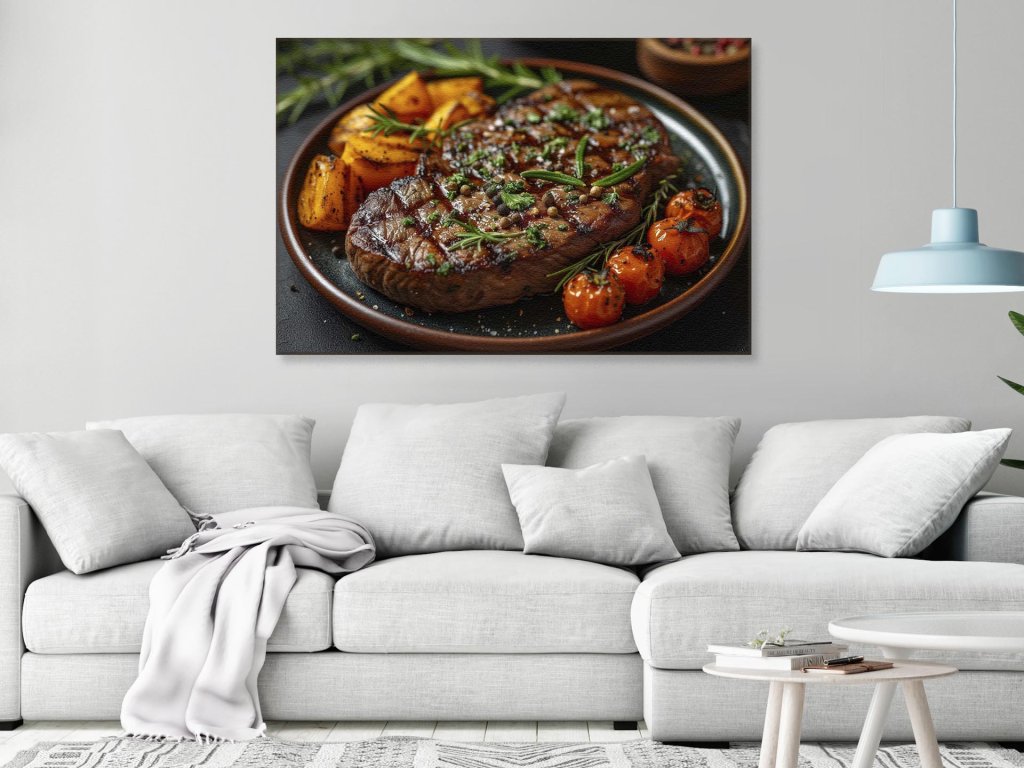 Na obrázku je výdatný steak pripravený na podávanie, obklopený pečenými zemiakmi a cherry paradajkami, ozdobený čerstvým rozmarínom a tymiánom. Mäso vyzerá šťavnaté a je posypané koreninami, čo sľubuje bohatú chuť. Všetko je naaranžované na tmavom tanieri, čo zdôrazňuje farby a textúry jedla.