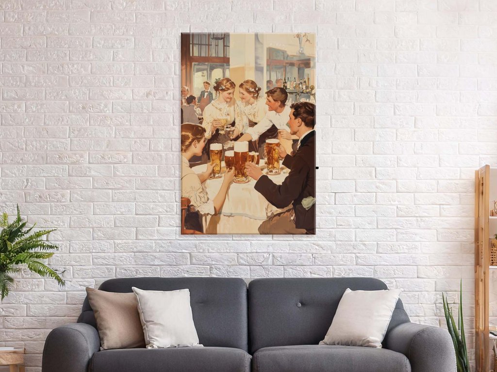Obraz zachytáva veselú skupinu ľudí sediacu okolo stola v tradičnej pivárni. Dve ženy v stredobode obrazu sa smejú a v rukách držia pivné krígle, pričom ostatní pri stole sú zapojení do uvoľnenej konverzácie. Atmosféra je priateľská a srdečná, symbolizujúca radosť z priateľstva a spoločných okamihov.