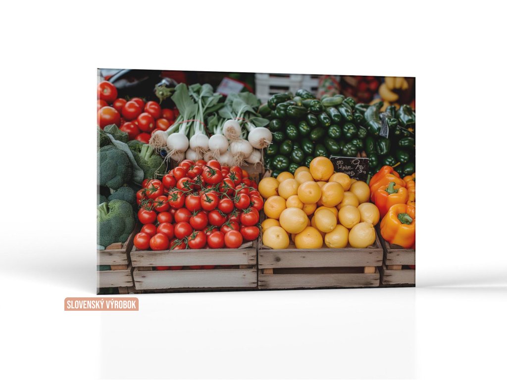Na obrázku je vidieť trhovisko plné čerstvej zeleniny, kde každý kúsok vyniká svojou intenzívnou farbou a čerstvosťou. Žiarivé červené paradajky sú pekne uložené vedľa slnečne žltých citrónov, zatiaľ čo sýto zelené papriky tvoria kontrast vedľa bielej cibuľky s jej jemnými zelenými stonkami. V pozadí sa týči tmavozelená brokolica a dozrievajúce zelené a oranžové papriky. Všetko spolu vytvára lákavú mozaiku vôní a chutí, ktorá slúži ako pozvanie k zdravému stravovaniu a podporuje miestne poľnohospodárstvo.