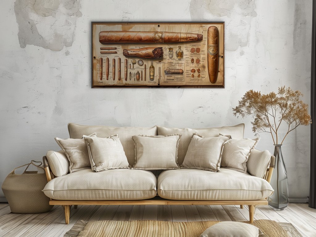 Tento obraz ponúka komplexný pohľad na rôzne druhy cigár, vrátane ich vnútorných štruktúr a komponentov. Každý prvok cigary je precízne ilustrovaný a označený, poskytujúc dôkladné informácie o jej konštrukcii a zložení. Tento detailný nákres slúži ako edukatívny nástroj pre milovníkov cigár, ktorí sa chcú dozvedieť viac o výrobe a vlastnostiach kvalitných cigár.