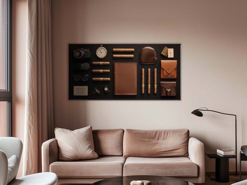 Tento obraz predstavuje luxusné doplnky spojené s pánskou eleganciou, starostlivo rozmiestnené na tmavom pozadí. Cítiť z neho nádych klasiky a sofistikovanosti, vyjadrený cez cigary, elegantné hodinky a kožené doplnky. Vytvára atmosféru moderného štýlu a vkusu, ktorý rezonuje s nadčasovou pánskou eleganciou.