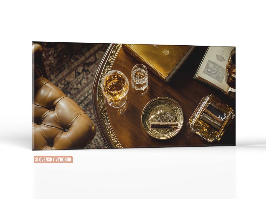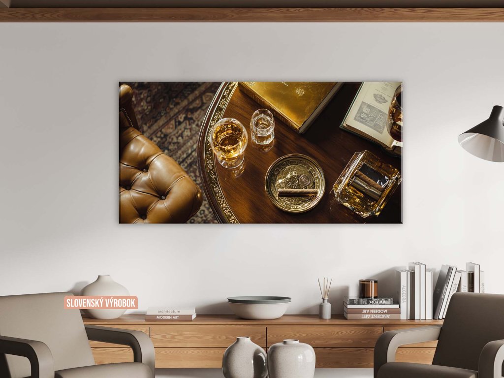 Obraz zachytáva atmosféru pohodlia a luxusu v interiéri, kde na krásne vyrezávanom drevenom stole stojí pohár whisky a vedľa neho leží cigara. Jemné detaily, ako zlatý popolník a knihy, dotvárajú dojem elegancie a pokoja. Scéna vyvoláva pocit relaxácie v sofistikovanom prostredí, ideálnom pre chvíle oddychu.