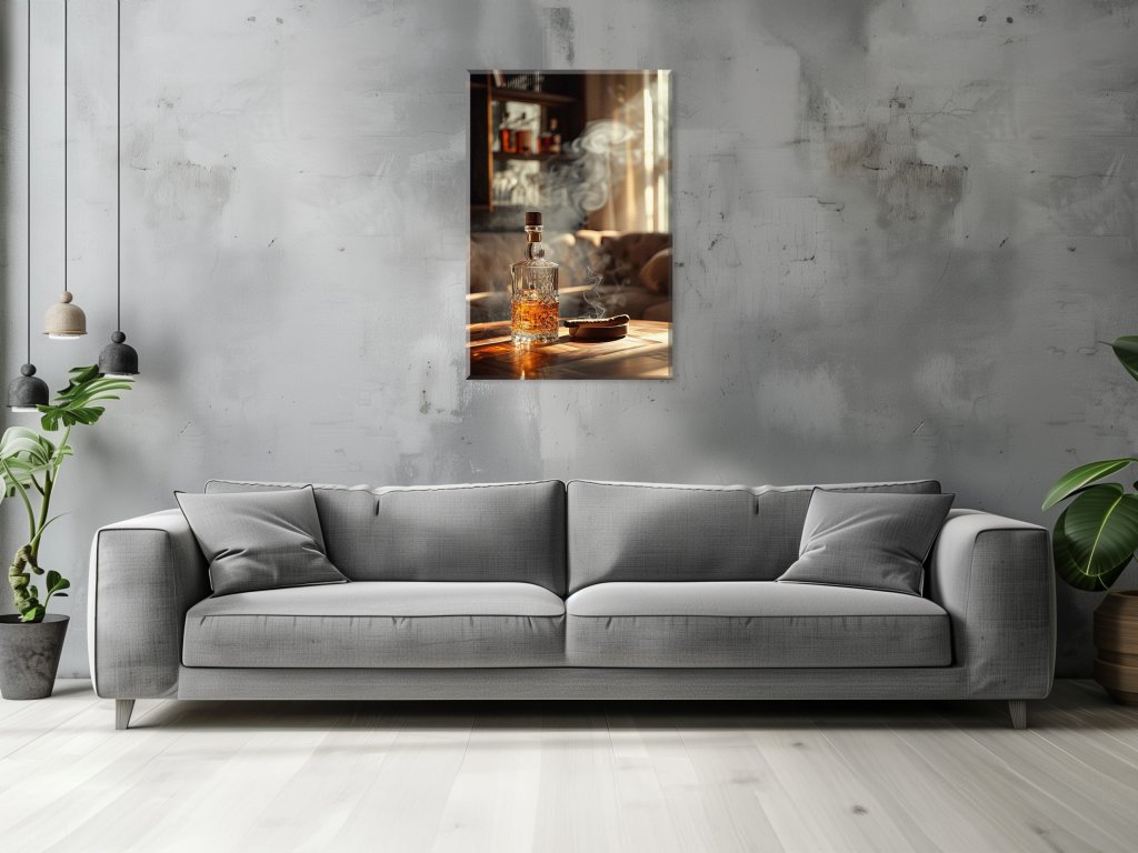 Na tomto obraze vidíme krásnu krištáľovú fľašu s whisky, ktorá stojí na elegantnom drevenom stole, osvetlená jemným svetlom prenikajúcim cez okno. Vedľa fľaše sa nachádza horiaca cigara položená v popolníku, pričom dym sa jemne vznáša vo vzduchu, čo dodáva obrazu pokojný a luxusný nádych. Prostredie naznačuje útulný a sofistikovaný interiér, kde človek môže relaxovať a vychutnať si chvíľu oddychu.