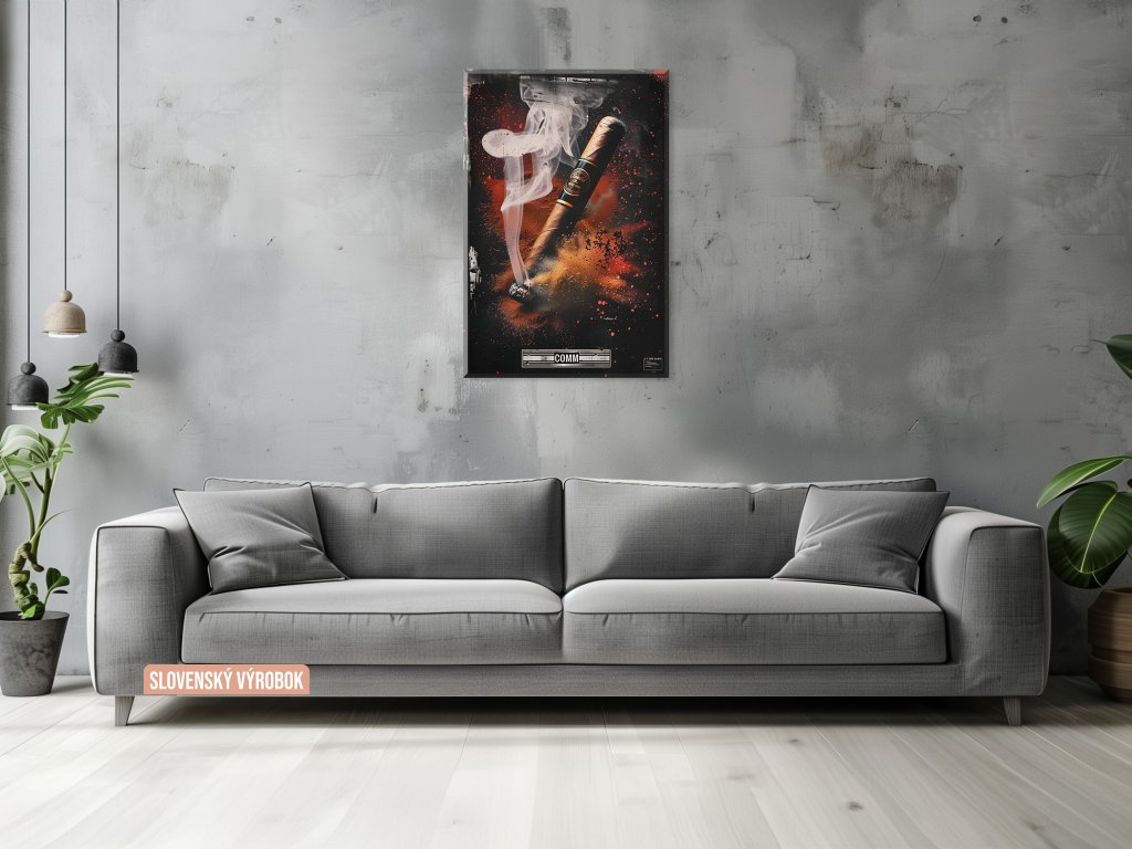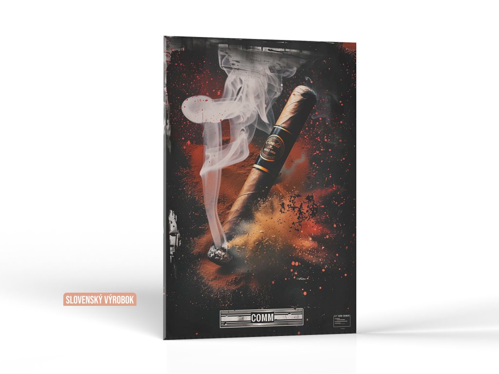Obraz zobrazuje zapálenú cigaru, z ktorej sa vinie hustý dym, vytvárajúci dynamickú a dramatickú atmosféru. Pozadie je plné ohnivých a tmavých tónov, ktoré zdôrazňujú intenzitu a vášeň spojenú s fajčením cigár. Detaily cigary a dymu sú precízne spracované, čo vytvára pocit hĺbky a realistickosti.