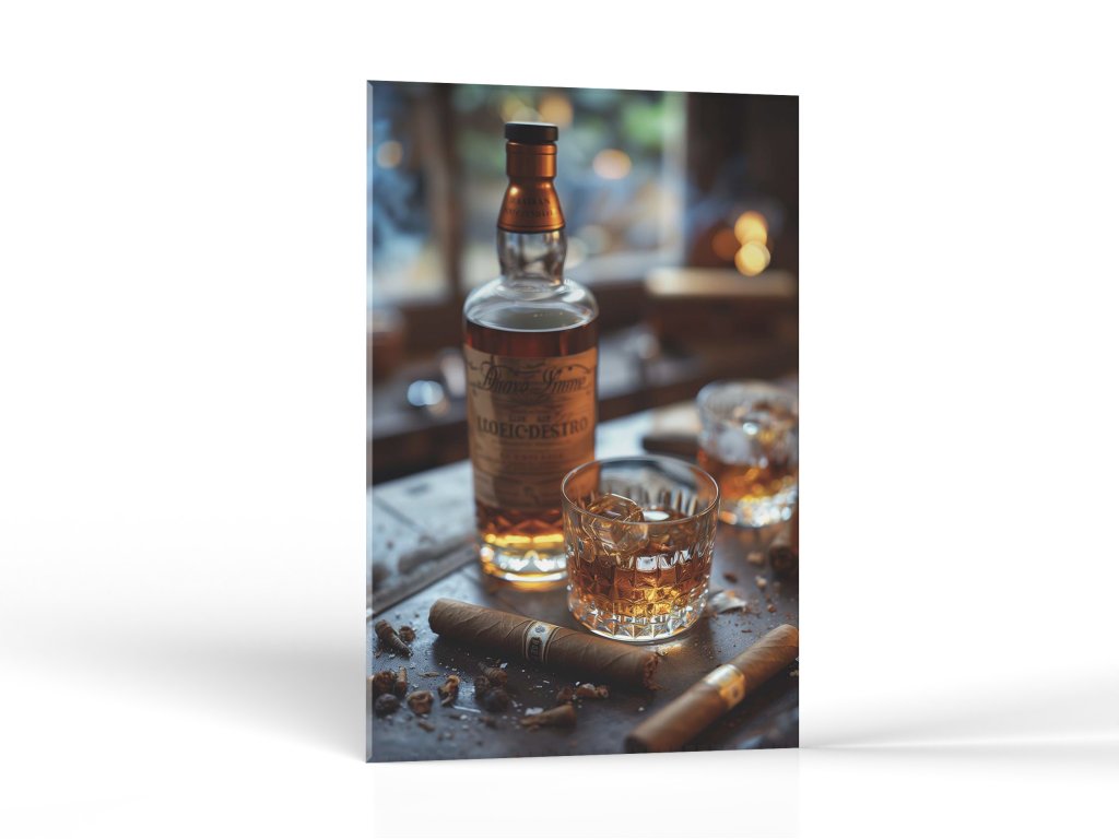 Na obraze je elegantný pohár plný whisky s ľadom, vedľa ktorého leží zapálená cigara. Scéna je zasadená do útulného prostredia s jemným osvetlením, ktoré vytvára príjemnú a relaxačnú atmosféru. Tento obraz evokuje chvíle pokoja a luxusu, ideálne pre milovníkov kvalitného nápoja a cigár.