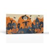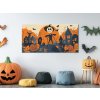 Tento obraz zachytáva scénu z temnej a tajomnej Halloweenovej noci, kde v popredí dominuje strašidelná postava s čiernym klobúkom a širokým úsmevom. V pozadí sa týčia staré domy, medzi ktorými lietajú netopiere, pričom celú atmosféru osvetľuje oranžový mesiac. Farebné tóny oranžovej a čiernej navodzujú napätie a mystiku tohto magického večera.