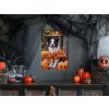 Tento obraz zachytáva rozkošného psíka oblečeného v oranžovom halloweenskom kostýme so vzorom čiernych netopierov. Psík sedí pokojne na pni obklopený vyrezanými tekvicami, ktoré umocňujú halloweenskú atmosféru. Jeho radostný výraz dodáva celej scéne hravú a prívetivú náladu.