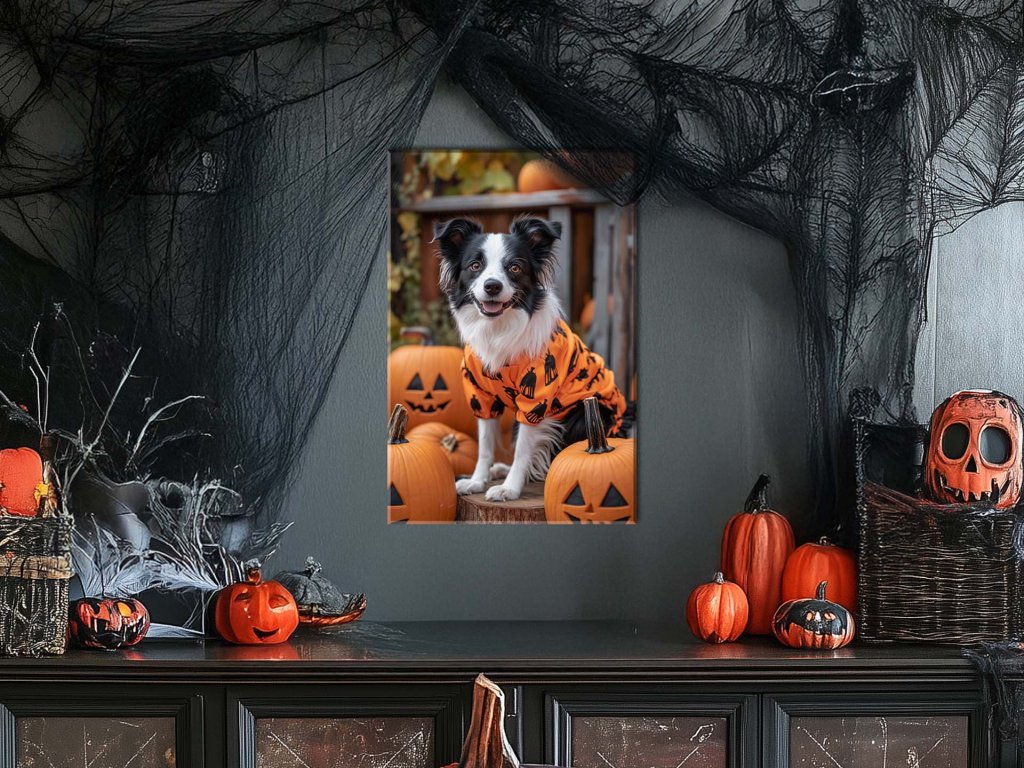 Tento obraz zachytáva rozkošného psíka oblečeného v oranžovom halloweenskom kostýme so vzorom čiernych netopierov. Psík sedí pokojne na pni obklopený vyrezanými tekvicami, ktoré umocňujú halloweenskú atmosféru. Jeho radostný výraz dodáva celej scéne hravú a prívetivú náladu.