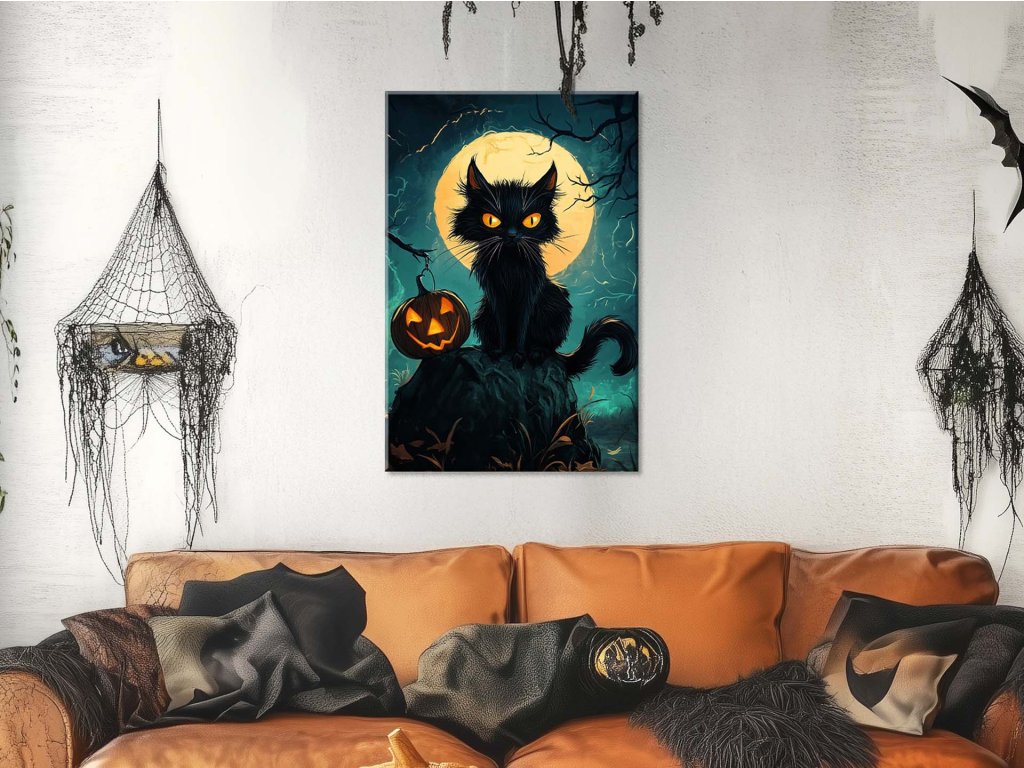 Na obraze je tajomná čierna mačka, ktorá sedí na kameni a upiera svoje žlté, svietiace oči na diváka. Vedľa nej je rozžiarená vyrezávaná tekvica, symbol Halloweenu, a za nimi sa týči veľký, jasný mesiac, ktorý osvetľuje celý les. Atmosféra obrazu je tajuplná a strašidelná, pričom kontrast medzi tmavou mačkou a svetlom mesiaca vytvára napätie a magický pocit.