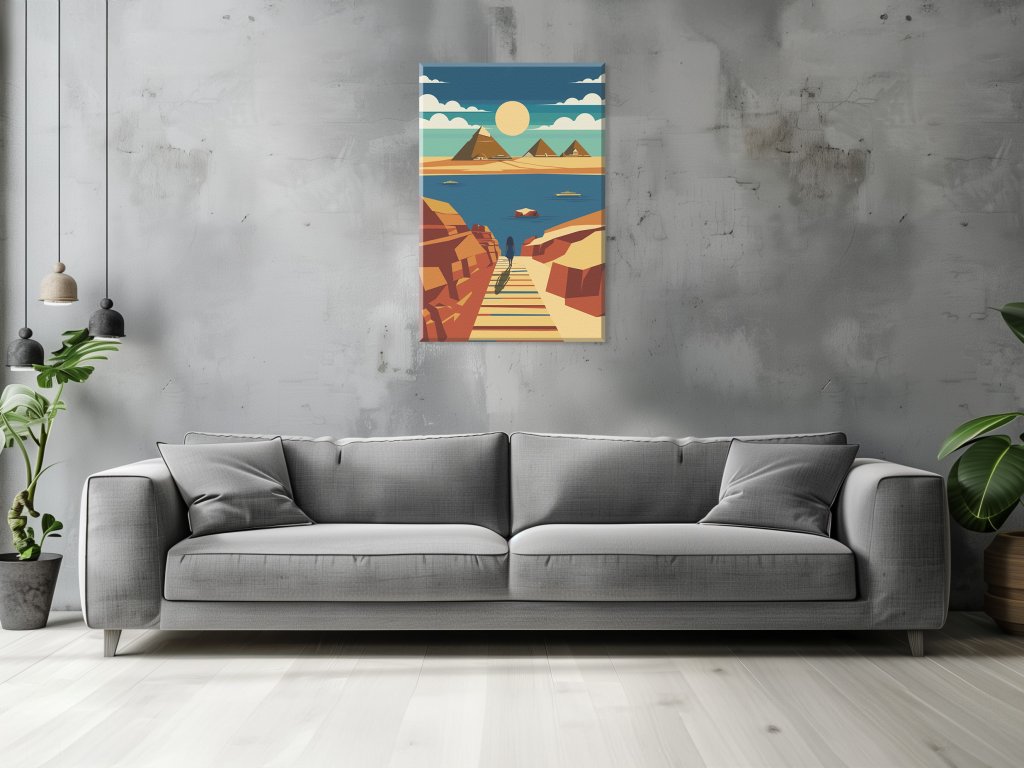 Obraz zobrazuje postavu kráčajúcu po drevenej ceste, ktorá vedie od vodnej plochy a smeruje k pyramídam na obzore. V pozadí sa týčia majestátne pyramídy pod jasným slnkom, zatiaľ čo loďky plávajú na hladine vody. Farby sú teplé a živé, zachytávajúc pokoj a veľkoleposť púštnej krajiny spojenú s historickými monumentmi.