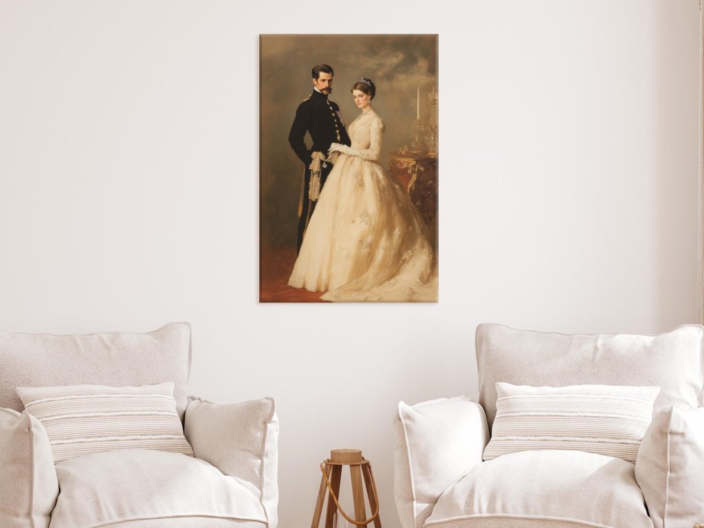 Tento majestátny portrét zobrazuje urodzený pár v slávnostnom postoji, ktorý evokuje šľachtickú dôstojnosť a aristokratickú noblesu. Muž v uniforme so zlatými detailmi a žena v bohato zdobenej bielej róbe symbolizujú silu a jemnosť v harmonickom spojení. Pozadie s luxusným nábytkom a svietnikmi dotvára dojem z kráľovského interiéru, kde sa spája krása, moc a tradícia.