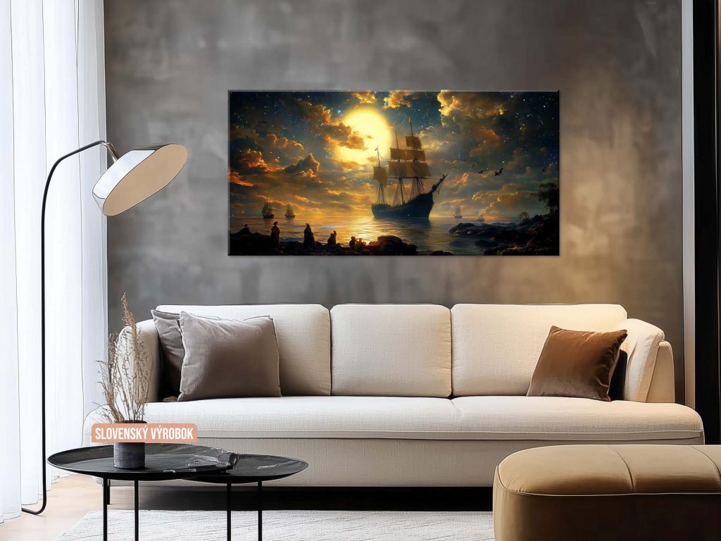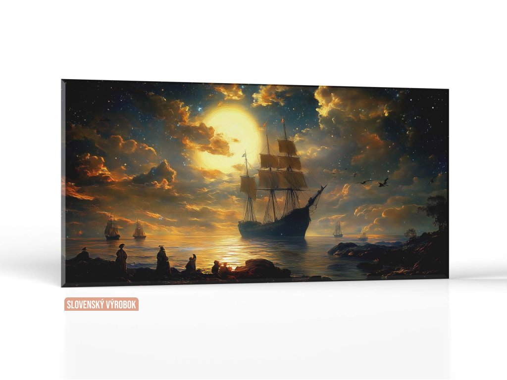 Veľká loď pláva pod jasným mesiacom, osvetlená jeho zlatým svetlom.