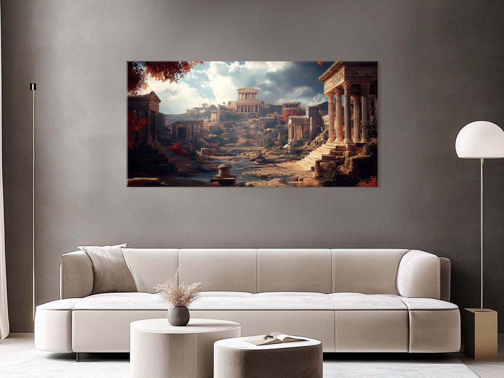 Na obraze vidíme majestátne staroveké chrámy, ktoré sa týčia nad rozpadnutými ruinami, pripomínajúc zašlú slávu starovekých civilizácií. Atmosféru dopĺňa krásna jesenná príroda s červenými lístkami stromov, ktoré oživujú okolie. Na oblohe sa rozprestierajú oblaky, ktoré pridávajú tajomnosť a dôstojnosť tejto scenérii, kde ticho a pokoj vládnu nad dávnymi pozostatkami.