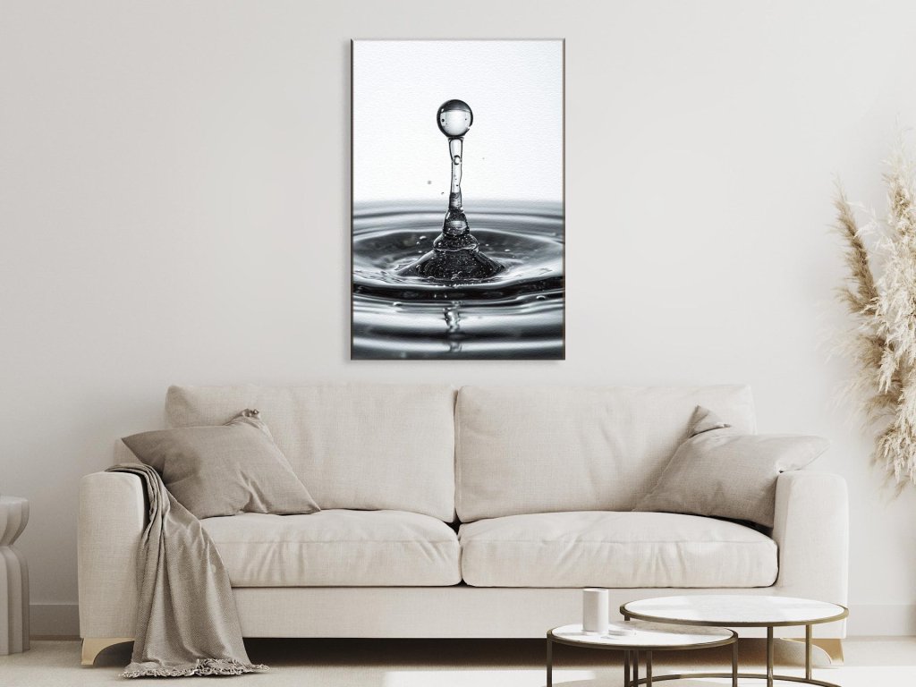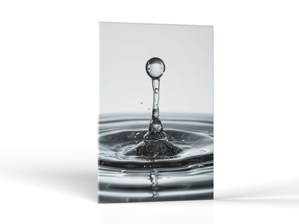 Fotografia zachytáva presný moment, kedy kvapka vody sa odrazí od hladiny a vytvára dokonalý stĺp s malými rozptýlenými kvapkami okolo. Odlesky svetla na kvapke a hladine vytvárajú jemnú a minimalistickú kompozíciu. Tento jednoduchý, ale výrazný obraz je príkladom nádhery a komplexnosti, ktorú môžeme nájsť v každodennom živote.