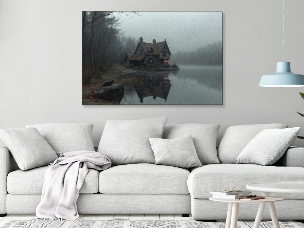 Na obraze je zobrazený starý vidiecky dom so šindľovou strechou a osvetlenými oknami, umiestnený pri brehu jazera. Jemná hmla zahaluje scénu a vytvára mystickú atmosféru, zatiaľ čo odraz domu na pokojnej vodnej hladine dodáva obrazu pokojný charakter. Čierna mačka na skalnom výbežku pridáva k pohľadu na krajinu element tajomstva.