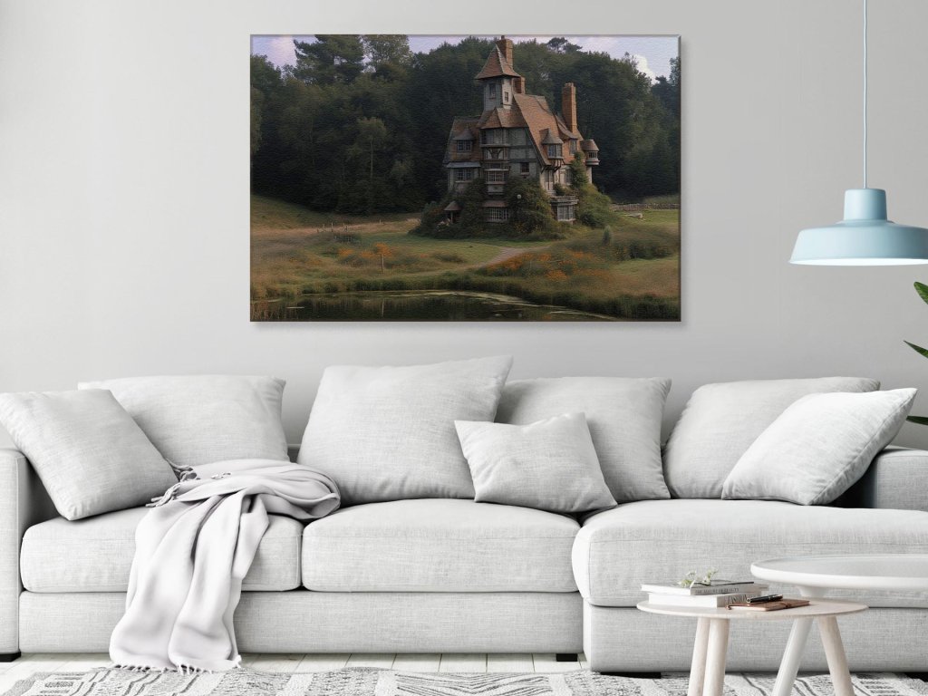 Veľký viacposchodový dom s charakteristickou strmou strechou a komínmi, obklopený bujnou zeleňou a lúčnymi kvetmi, vykúkajúci z pokojného prírodného prostredia. Dom je súčasťou idylickej krajiny, kde ticho prerušuje len šum vetra v korunách stromov a zrkadlenie vody v jazierku. Cesta vedúca k domu naznačuje izolovanosť a súkromie, ktoré toto miesto poskytuje.