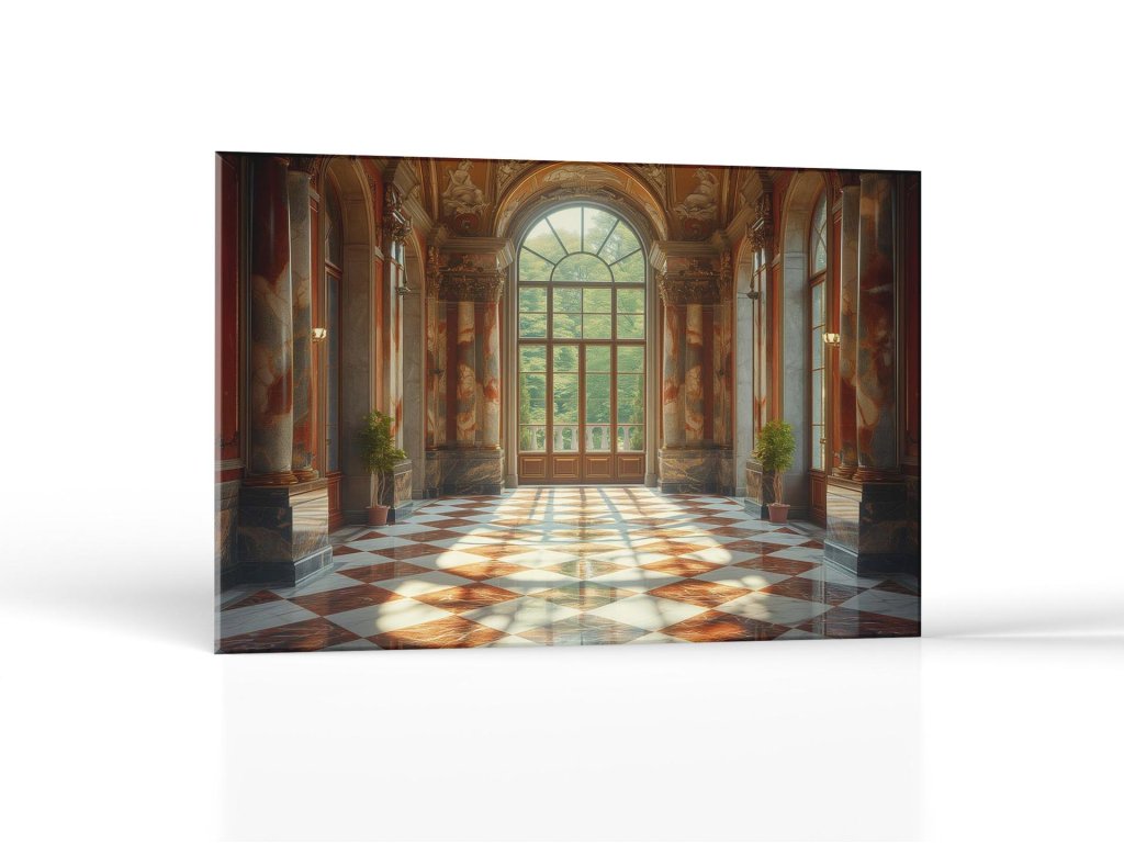Obraz zachytáva slnečnú halu s mramorovou podlahou a stĺpmi, ktoré odhaľujú bohaté zdobenie a architektonické detaily. Veľké okno v zadnej časti haly otvára výhľad na zeleň a vpúšťa do miestnosti prírodné svetlo. Priestor pôsobí vznešene a pokojne.