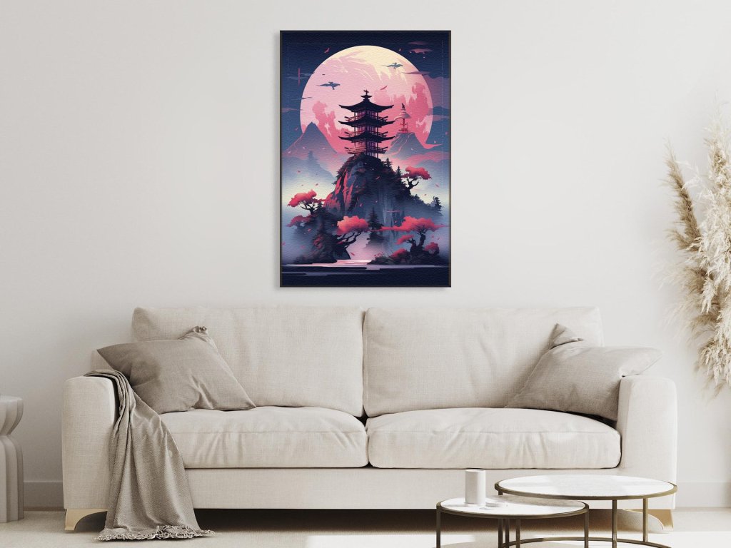 Pagoda, ktorá sa vypína na vrchole strmého útesu, je dominantným prvkom tohto umenia, s veľkým červeným mesiacom na oblohe vytvárajúcim atmosférické pozadie. Dramatická hra svetla a tieňov dodáva scéne mystickú atmosféru, zatiaľ čo jemné siluety lietajúcich vtákov pridávajú pocit života. Celý obraz je prevedený v teplých odtieňoch červenej a fialovej, čo evokuje pokojný večer v horskej krajine.