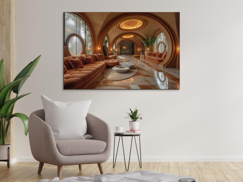 Luxusne vyzerajúci interiér s mäkkým oranžovým sedením, zaoblenými oblúkovými stenami a výklenkami, akcentovaný teplým osvetlením. Interiér kombinuje plynulé línie a prirodzené svetlo, ktoré preniká cez okrúhle okná, vytvárajúc príjemný a pohodlný priestor. Dominantné teplé tóny a materiály dotvárajú atmosféru luxusu a pohody.