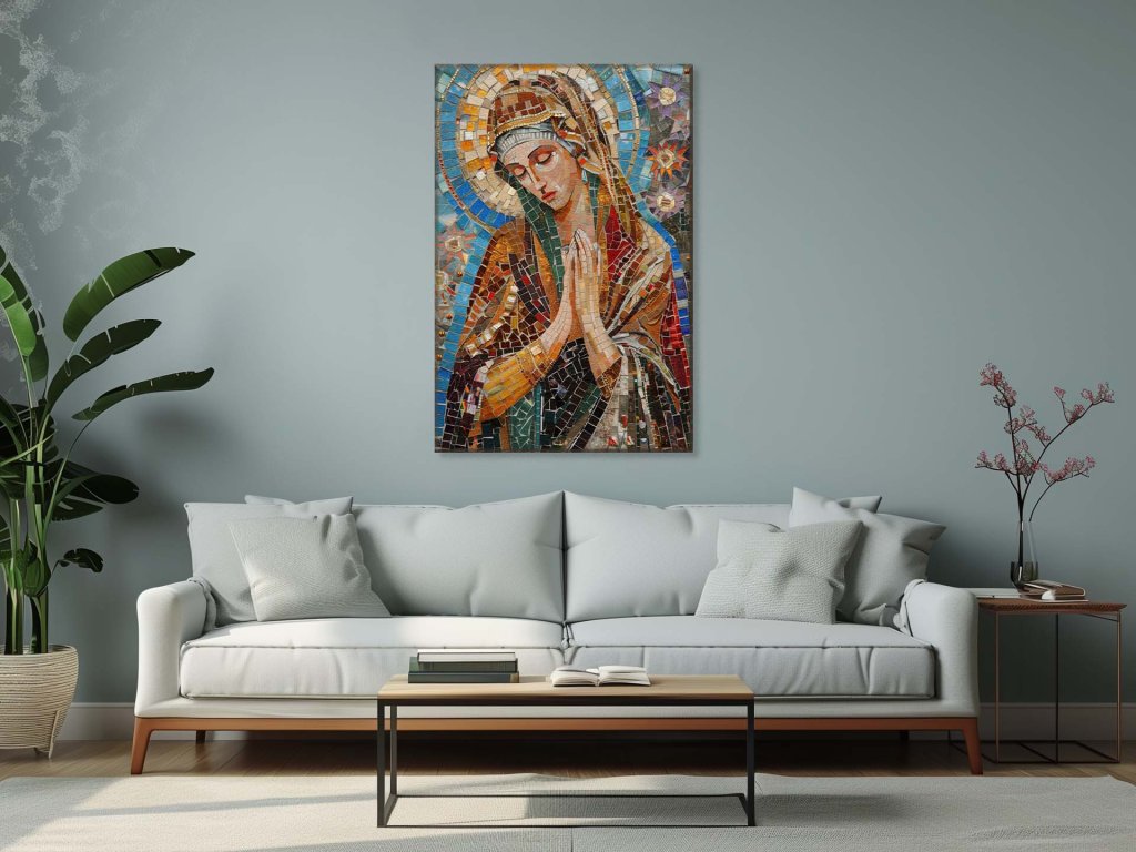 Tento detailný mozaikový obraz zobrazuje ženu s očami zatvorenými v modlitbe, s hlavou pokrytou bohato zdobeným závojom. Mozaika je plná živých farieb a odleskov, ktoré vytvárajú dojem hĺbky a duchovnosti. Zlaté a bronzové tóny mozaiky sú zdôraznené proti svetlomodrému a tmavomodrému pozadiu, vytvárajúc tak pocit svätosti a pokoja.