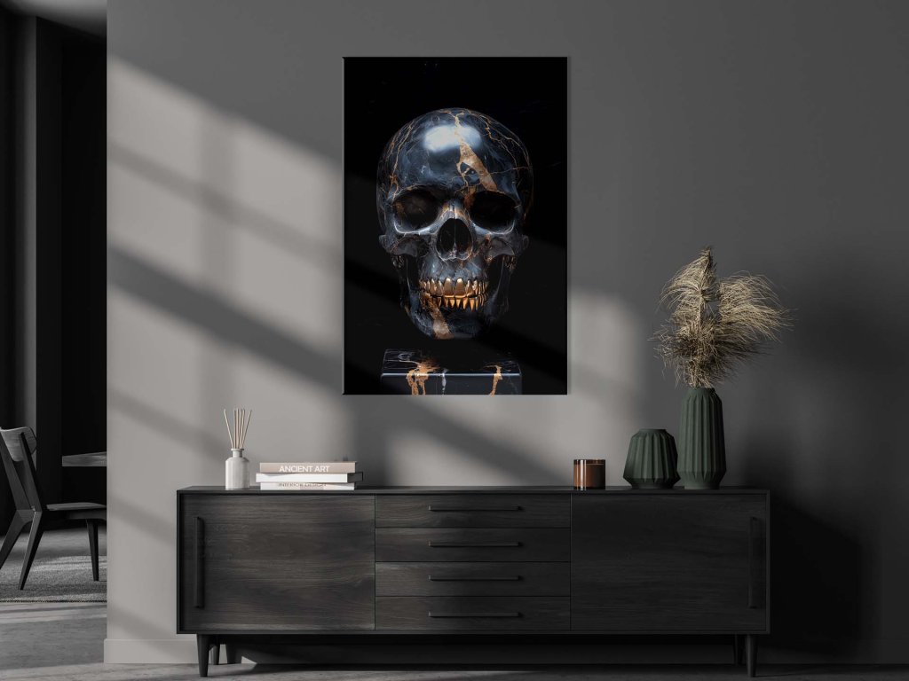 Obraz zobrazuje čiernu mramorovú lebku so zlatými prasklinami a zubami.