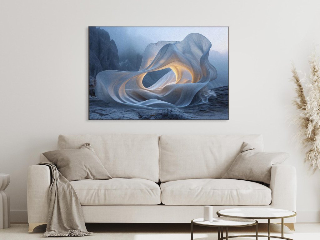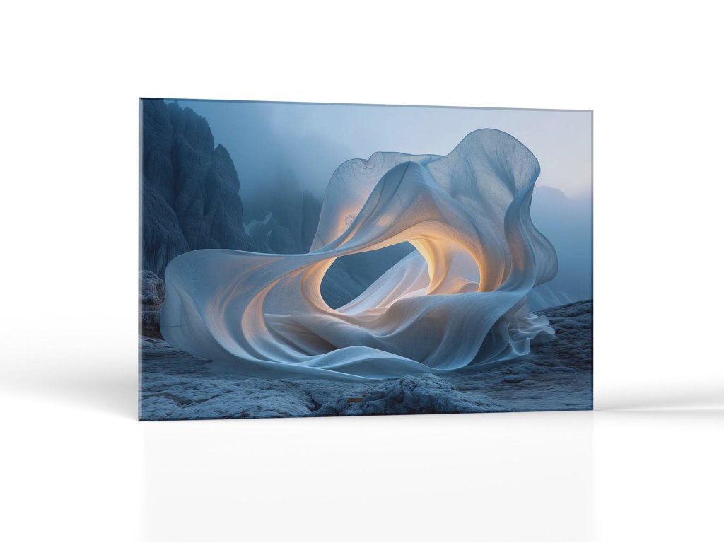 Biela, translucidná štruktúra pripomínajúca zamrznutú vlnu sa vlní na pozadí zubatých hôr obalených hmlou. Oranžové svetlo sa jemne odráža na vnútorných povrchoch štruktúry, vytvárajúc pocit tepla v kontraste s modrastým chladom okolia. Celý obraz vyvoláva dojem pokoja v ostrom horskom prostredí.