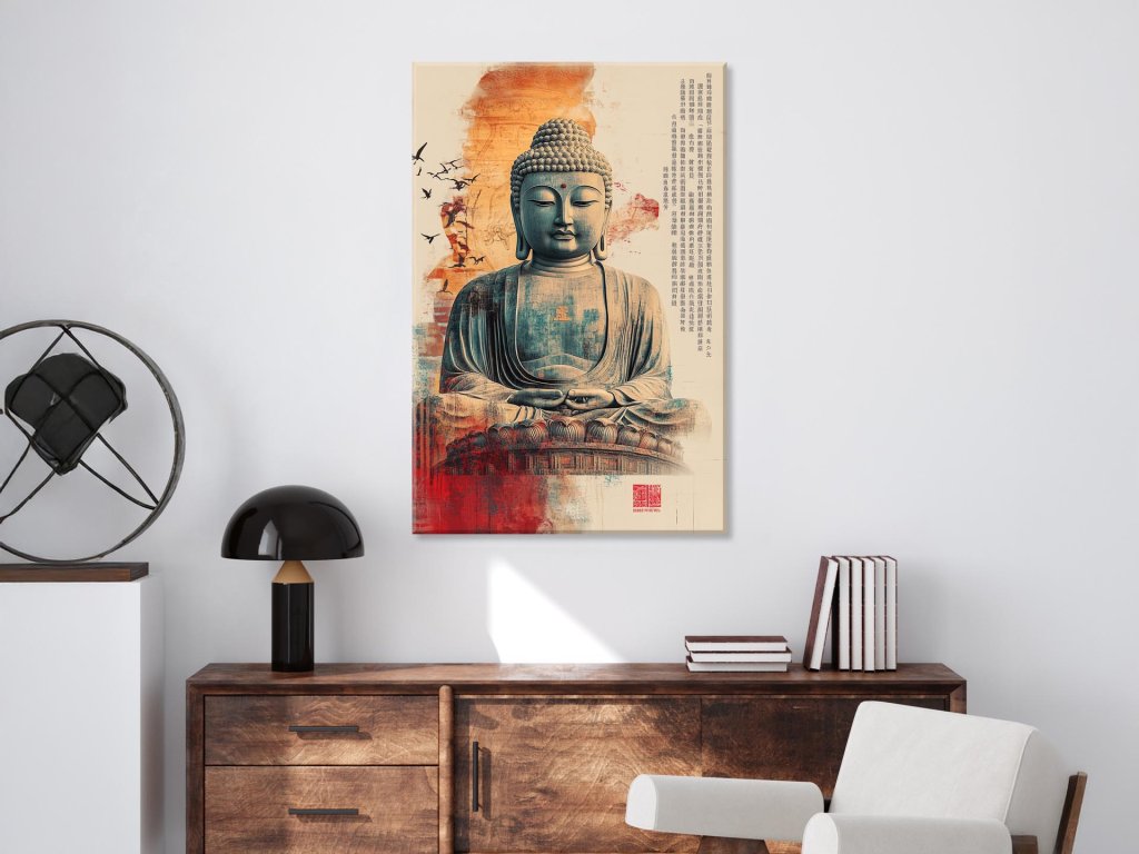 Tento obraz zachytáva sochu Buddhu v tradičnej meditačnej pozícii, vyžarujúcu vnútorný pokoj a múdrosť. Kompozícia je doplnená o jemné oranžovo-modré textúry a siluety vtákov, ktoré prinášajú pocit duchovného prechodu a slobody. Vpravo sa nachádza zvislý stĺpec textu v čínskych znakoch, ktorý dodáva obrazu hĺbku a autentický kultúrny kontext.