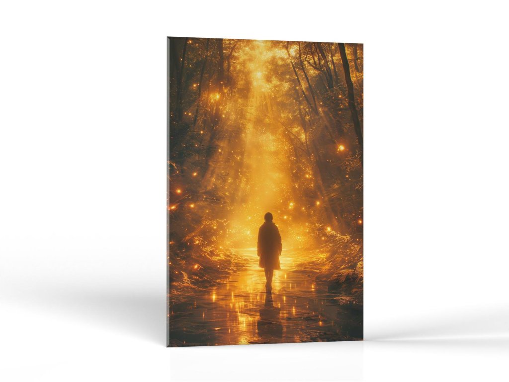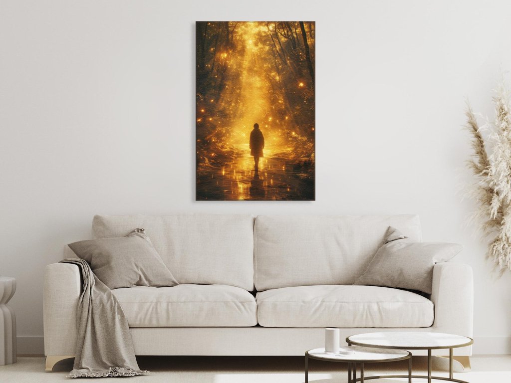 Tento obraz zachytáva osamelého pútnika, ktorý stojí na lesnej ceste zaliatej tajomným zlatým svetlom. Svetelné lúče prenikajúce medzi stromami vytvárajú dojem magického momentu alebo prebúdzajúcej sa sily. Scéna vyvoláva pocity spokojnosti, zázraku a hlbokého spojenia s prírodou.