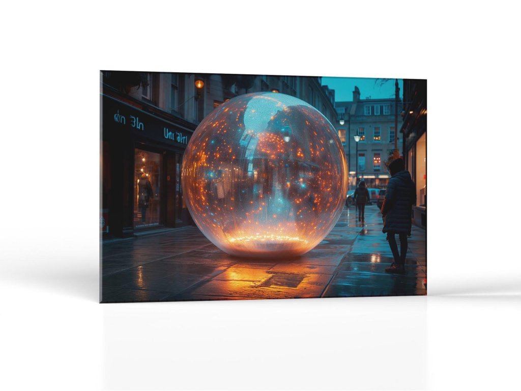 Veľká svietiaca guľa umiestnená na dláždenom chodníku, ktorá osvetľuje svoje okolie jemným, oranžovým svetlom. Na pozadí vidieť obrysy budov a ľudí, ktorí pridávajú život mestskej scéne. Západ slnka a umelé osvetlenie obchodov vytvára atmosféru skorého večera.